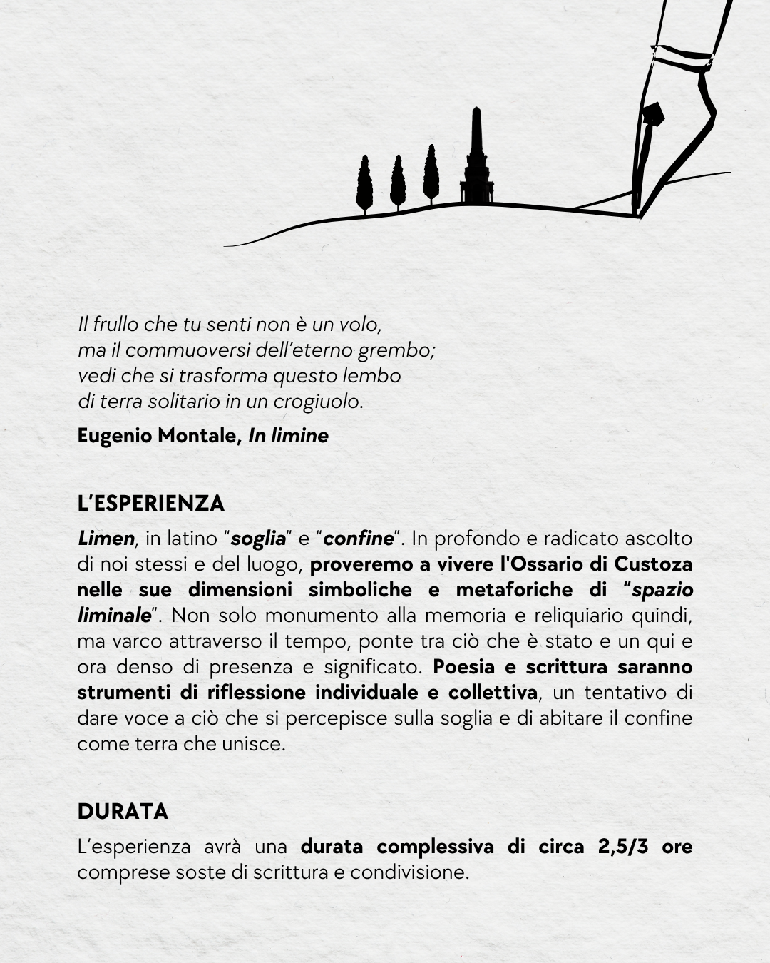 In profondo e radicato ascolto di noi stessi e del luogo, proveremo a vivere l'Ossario di Custoza nelle sue dimensioni simboliche e metaforiche di spazio di soglia, confine. Non solo monumento alla memoria e reliquiario quindi, ma varco attraverso il tempo, ponte tra ciò che è stato e un qui e ora denso di presenza e significato. Poesia e scrittura saranno strumenti di riflessione individuale e collettiva, un tentativo di dare voce a ciò che si percepisce sulla soglia e di abitare il confine come terra che unisce.