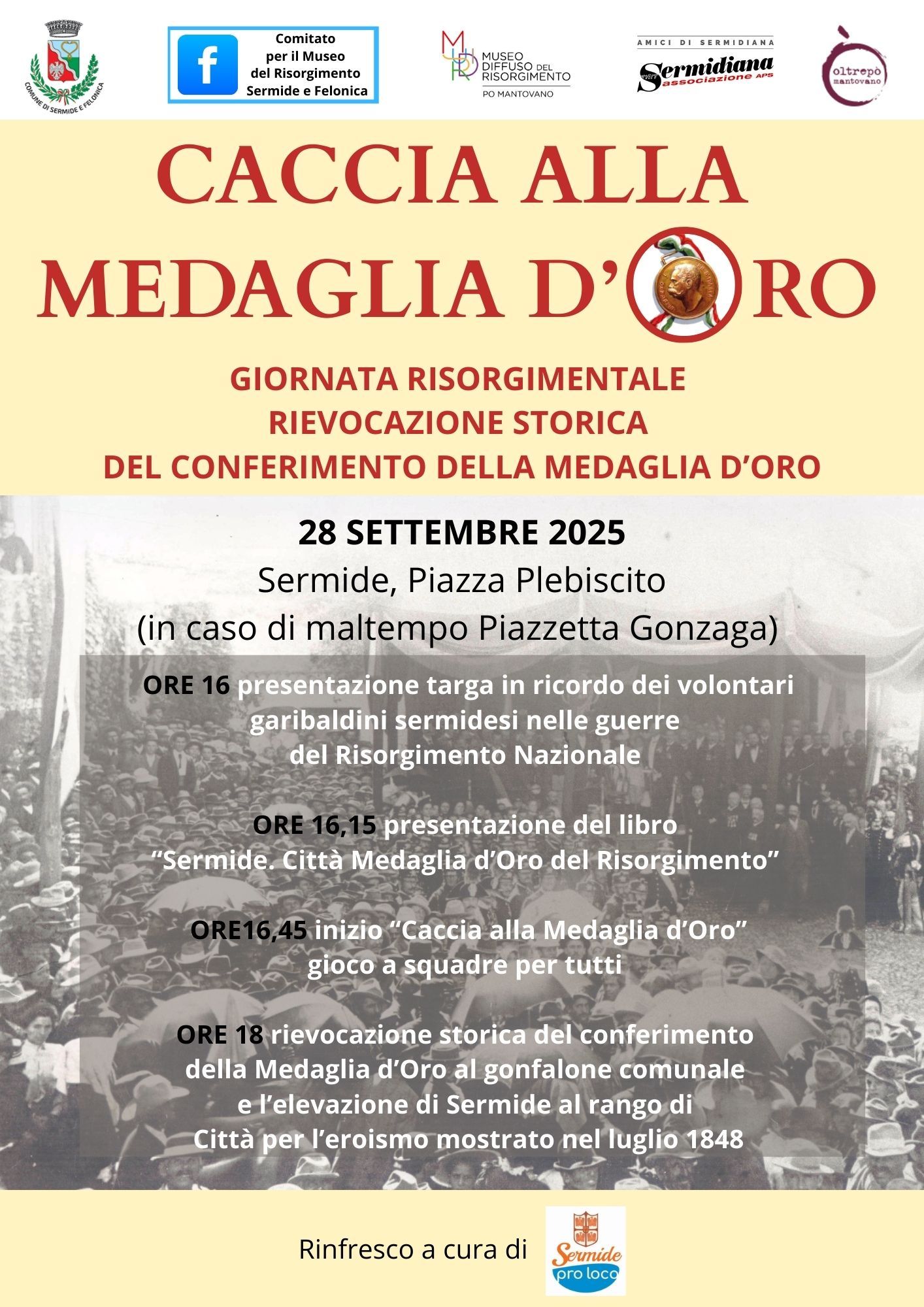 - ore 18 Rievocazione storica del conferimento della Medaglia d'Oro al gonfalone comunale e l'elevazione di Sermide al rango di Città per l'eroismo mostrato nel luglio 1848