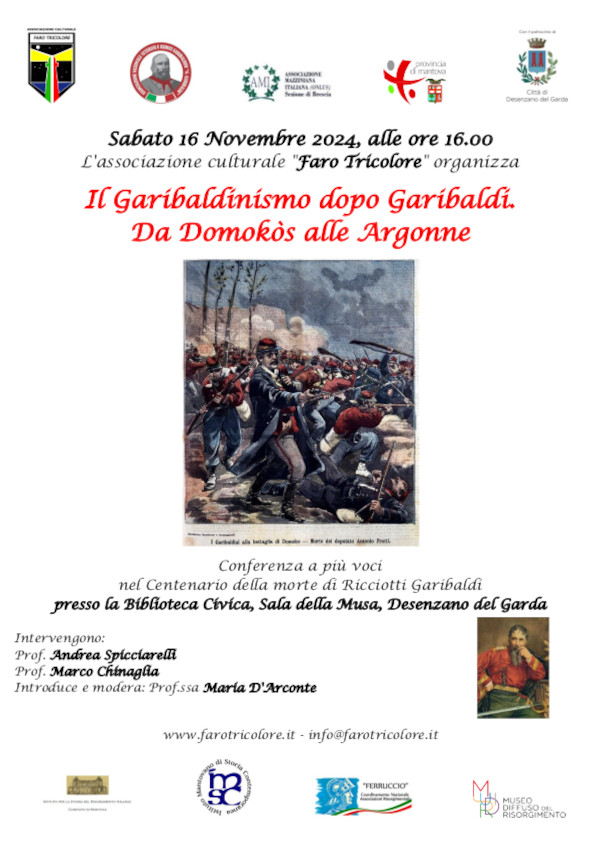 A cento anni dalla morte di Ricciotti Garibaldi, l’Associazione Culturale “Faro Tricolore” con sede a Desenzano del Garda organizza la Conferenza “Il Garibaldinismo dopo Garibaldi. Da Domokòs alle Argonne” al fine di valorizzare l’eredità spirituale di Giuseppe Garibaldi, che si evidenzia nell’azione dei figli, Ricciotti e Menotti, ma anche dei nipoti dell’Eroe dei Due Mondi sui vari fronti in cui si lotta per la libertà dei popoli oppressi e per la libertà tout court.