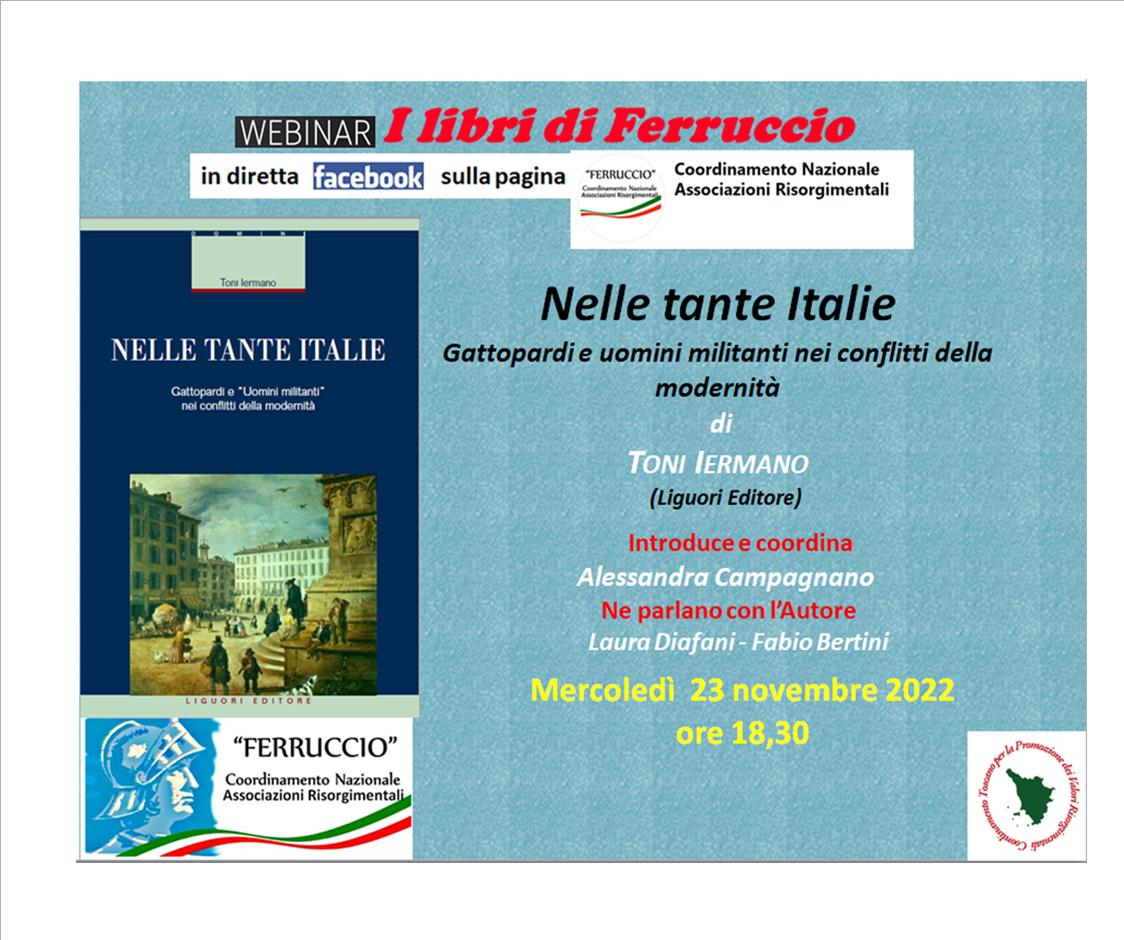 Per il ciclo I Libri del Ferruccio, verrà presentato il libro di Toni Iermano, "Nelle tante Italie. Gattopardi e uomini militanti nei conflitti della modernità", sulla complessità dei caratteri e delle qualità umane che s’intrecciarono alla vicenda risorgimentale, tra i valori autentici del patriottismo e i disvalori dell’opportunismo, specialmente in relazione alla storia critica della letteratura italiana. Introduce Alessandra Campagnano; dialogano con l’autore Laura Diafani e Fabio Bertini.